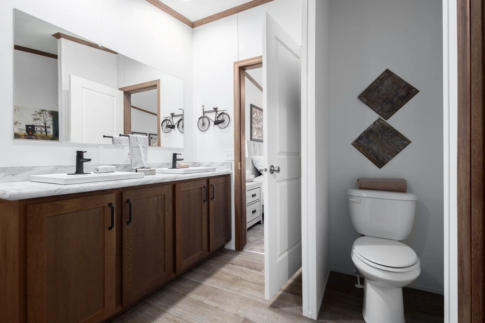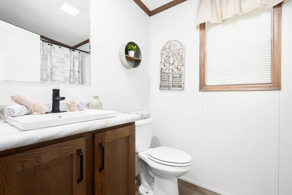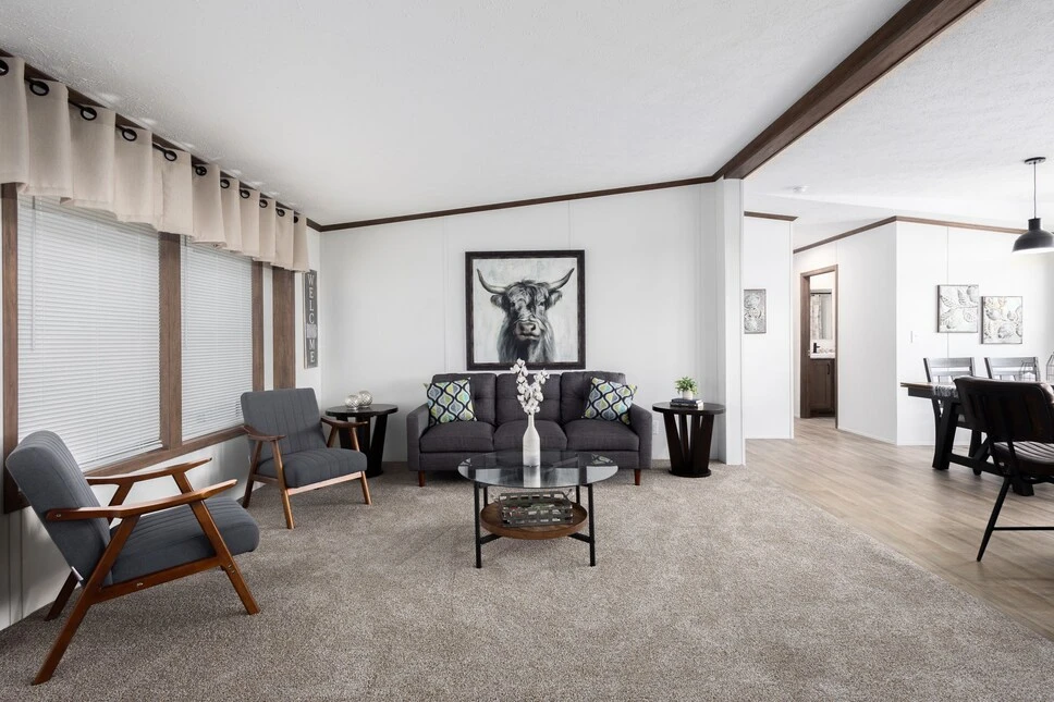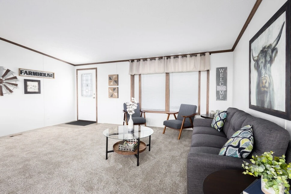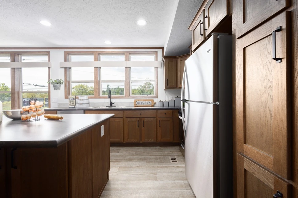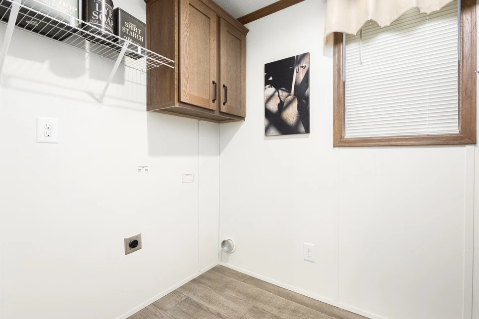 The Aldebaran 28523G is a spacious 1,387 sq. ft. double-wide featuring 3 bedrooms and 2 baths. This home boasts 8’ sidewalls with flat ceilings and premium Shaw flooring throughout. The kitchen is a highlight, offering mission-style cabinetry with soft-close guides and staggered overheads. Engineered for efficiency, it includes Low-E windows, R-19 wall insulation, and a transverse floor system to ensure long-term durability and comfort.