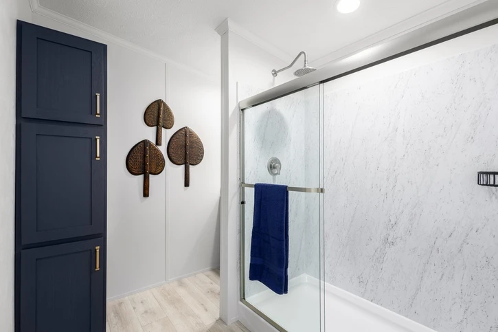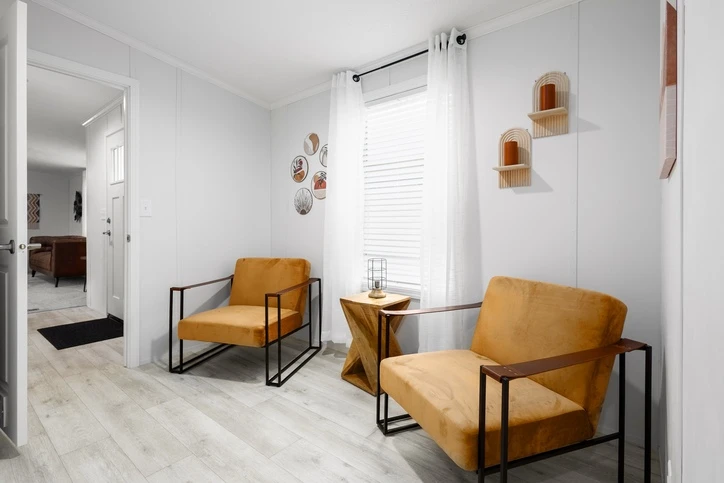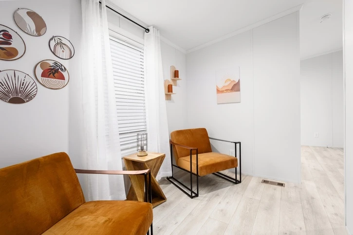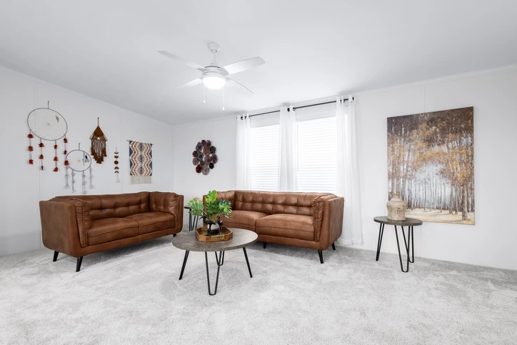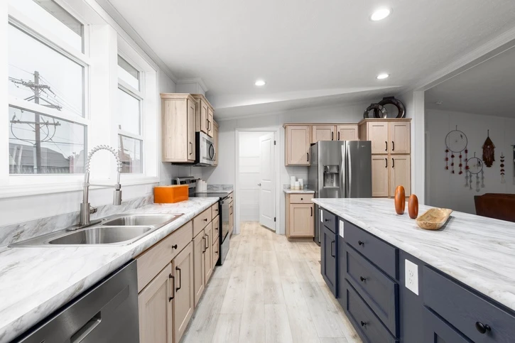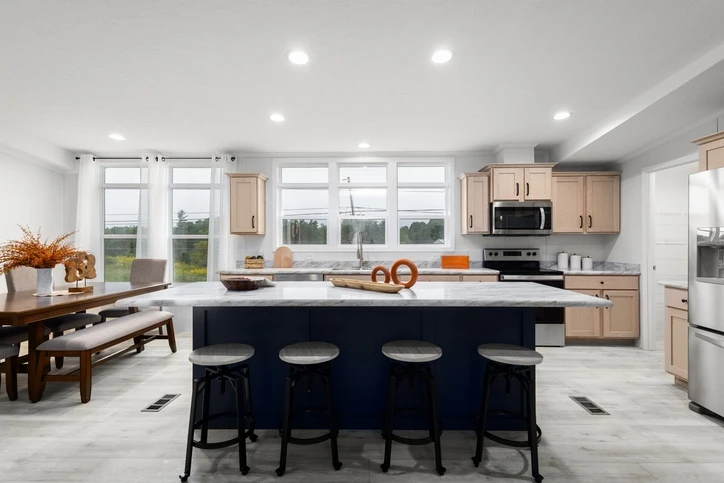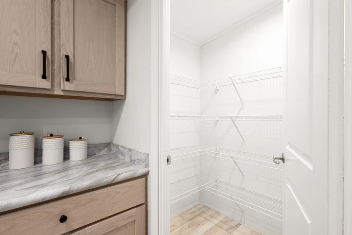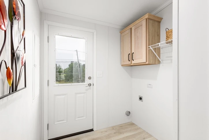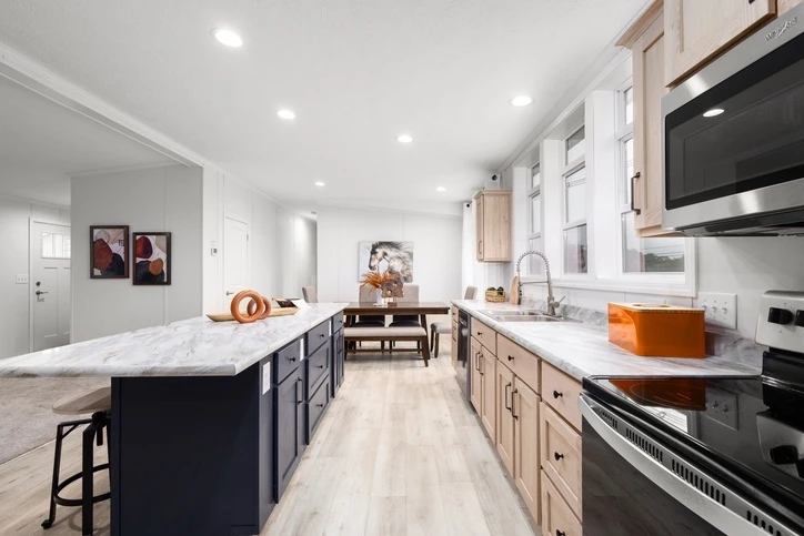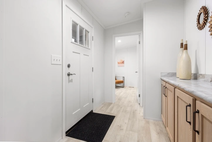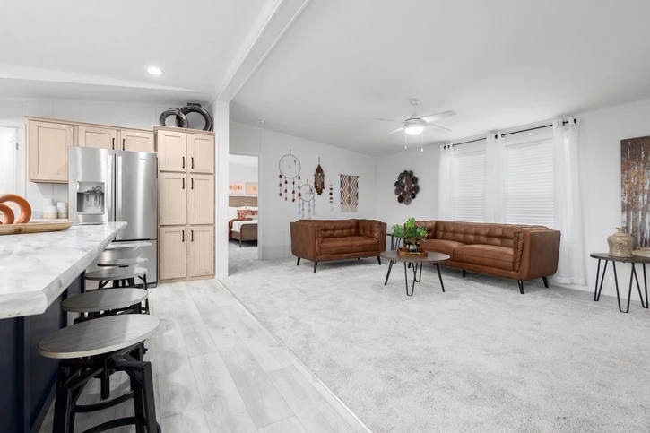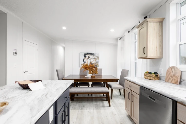 The Mintaka 28643E is a premier 1,707 sq. ft. double-wide home offering a spacious 3-bedroom, 2-bathroom layout. It features 8’ sidewalls with flat stipple ceilings and durable Shaw flooring. The high-end kitchen includes mission-style cabinetry, 30” staggered overheads, and soft-close drawer guides. Built with 2x6 exterior walls and a robust transverse floor system, this home ensures maximum energy efficiency with Low-E windows and R-19 wall insulation.