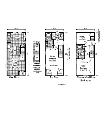 The Marquette 26303BM is a sophisticated 1,560 sq. ft. modular two-story home featuring 3 bedrooms and 2.5 bathrooms. Built with 2x10 floor joists and 2x6 exterior walls, it ensures high-end structural integrity and a smooth drywall finish. The interior is highlighted by colonial trim and a gourmet kitchen with 42” hardwood cabinets and soft-close hardware. With R-38 insulation and a 200 AMP service, this model provides an energy-efficient, premium living experience designed for lasting quality.