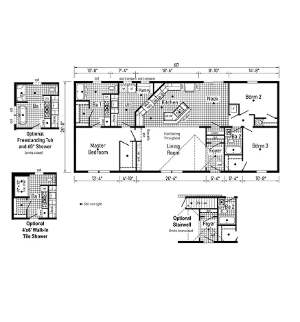 The Capella 28603A is a spacious 1,600 sq. ft. double-wide featuring 3 bedrooms and 2 bathrooms. This home offers 8’ sidewalls, flat stipple ceilings, and premium Shaw flooring throughout. The kitchen is designed for convenience with mission-style cabinetry, soft-close drawer guides, and staggered overheads. Built with a robust transverse floor system and 2x6 exterior walls, it provides energy-efficient comfort with Low-E windows and R-19 insulation.