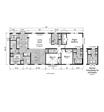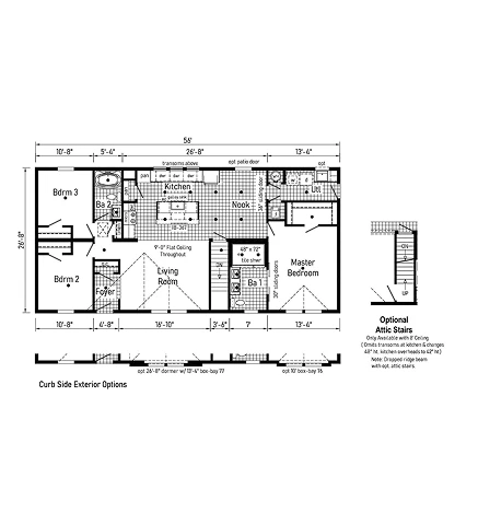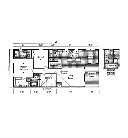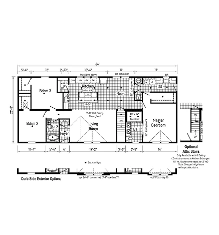 The Pebble Beach 28643AM is an expansive 1,707 sq. ft. modular double-wide featuring 9' sidewalls and finished drywall. The kitchen is equipped with 48" hardwood mission cabinets, a Pearl stainless steel appliance package, and a full ceramic backsplash. Built with 2x10 floor joists and a 40# roof load, this 3-bed/2-bath home provides structural excellence. A luxurious 48"x72" master ceramic shower and R-31 ceiling insulation complete this high-end residence.
