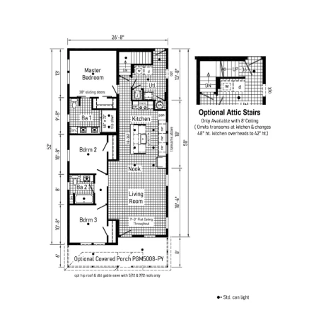 The Pine Valley 28523AM is a refined 1,360 sq. ft. modular ranch featuring 9' sidewalls and smooth finished drywall. The kitchen is highlighted by 48" hardwood mission cabinets, a Pearl stainless steel appliance package, and a full ceramic backsplash. Built with 2x10 floor joists and a 40# roof load, this 3-bed/2-bath home ensures structural durability. A luxurious 48"x72" master ceramic shower and R-31 ceiling insulation complete this high-end residence.