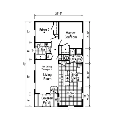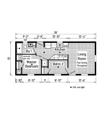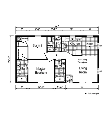 The Bungalow 12 24482A is a comfortable 1,022 sq. ft. double-wide home featuring a spacious 2-bedroom, 2-bathroom layout. Designed for modern living, it offers 8’ sidewalls, flat stipple ceilings, and premium Shaw flooring. The central kitchen is well-appointed with mission-style cabinetry, crown molding, and soft-close drawer guides. Built for lasting durability and energy savings, the home is constructed with 2x6 exterior walls and a robust transverse floor system, complemented by Low-E windows and high-quality fiberglass insulation.