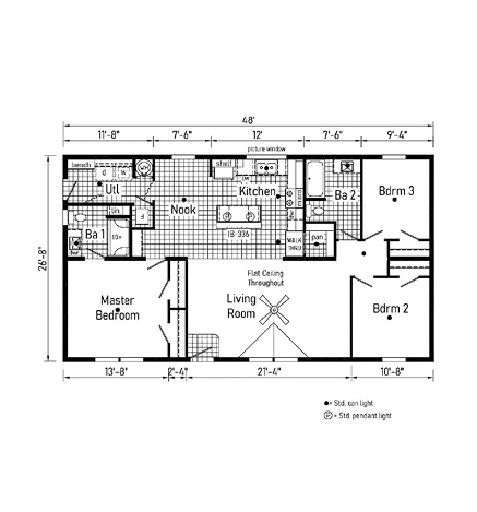 The Aldebaran 28523G is a spacious 1,387 sq. ft. double-wide featuring 3 bedrooms and 2 baths. This home boasts 8’ sidewalls with flat ceilings and premium Shaw flooring throughout. The kitchen is a highlight, offering mission-style cabinetry with soft-close guides and staggered overheads. Engineered for efficiency, it includes Low-E windows, R-19 wall insulation, and a transverse floor system to ensure long-term durability and comfort.