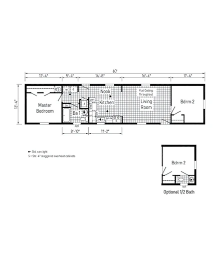 Experience the refined design of the Charger 14562A, a 747-square-foot home from the Blazer Select series. This two-bedroom, two-bathroom single-wide stands out with a modern kitchen island, stainless steel appliances, and unique cubbies over the cabinets for extra storage. The master suite offers luxury with double lav sinks and a 60” fiberglass shower. Built for efficiency and style, it features Low-E windows, a ceiling fan, and 2x6 exterior walls, providing a high-end feel in a smart, compact footprint.
