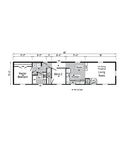 The Mars 14682A from the Astro Creations series offers a generous 907 square feet of living space, featuring a 2-bedroom, 2-bathroom layout. This single-wide home is built with 8’ sidewalls, 2x6 exterior walls, and energy-efficient vinyl Low-E windows. The interior boasts a mission-style kitchen with 42” overhead cabinets and soft-close drawer guides, while the dual-bathroom configuration includes 60” fiberglass tub/showers and square china lavs. It is also eligible for the Premier Plus pack for upgraded hardwood finishes and finished drywall.