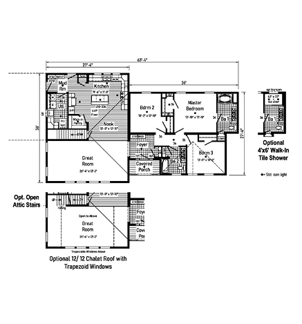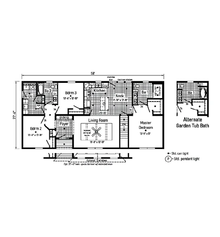 The American Spirit 1 28503AM is a robust 1,367 sq. ft. ranch featuring 3 bedrooms and 2 bathrooms. This modular home is built with 2x10 floor joists, 2x6 exterior walls, and smooth drywall. The interior features colonial molding and a premium kitchen with 42” hardwood cabinets and soft-close hinges. With R-38 ceiling insulation and 200 AMP service, it offers exceptional energy efficiency and modern durability in a classic, high-value ranch style.