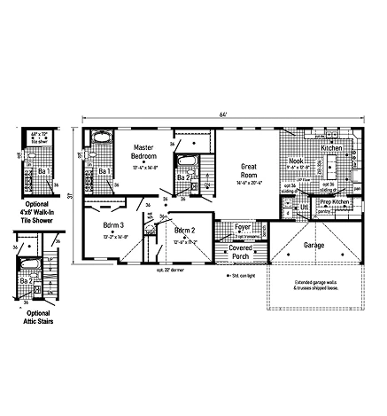 The Binkley 2 32543AM is a spacious 1,674 sq. ft. modular ranch featuring 3 bedrooms and 2 bathrooms. This high-quality home is constructed with 2x10 floor joists and 2x6 exterior walls, finished with smooth drywall and colonial molding. The gourmet kitchen boasts 42” hardwood mission cabinets with soft-close hardware and dovetailed drawers. With R-38 ceiling insulation and 200 AMP service, this model provides an energy-efficient, premium living experience built for long-term comfort and structural integrity.