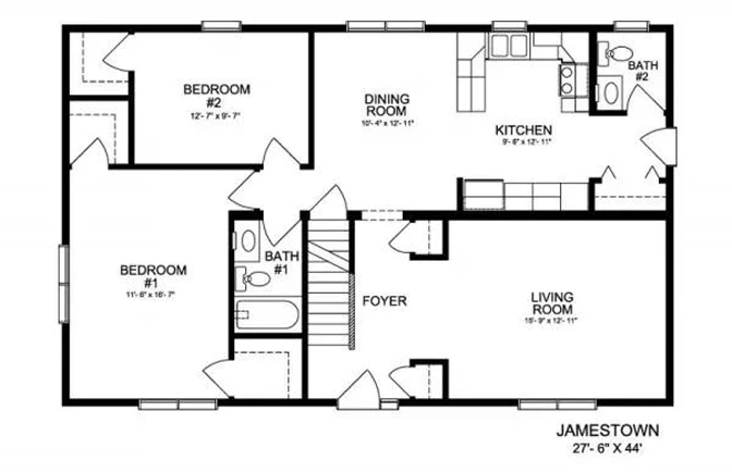 The Jamestown model offers a perfectly balanced footprint designed for modern living. With 1,210 square feet of finished living space on the main level, this plan includes two bedrooms and one-and-a-half baths. The home's exterior dimensions are 27'-6" x 44'. A key benefit of this Cape Cod style is the expansive, unfinished second floor, which provides an additional 1,210 square feet ready to be customized for your future needs.