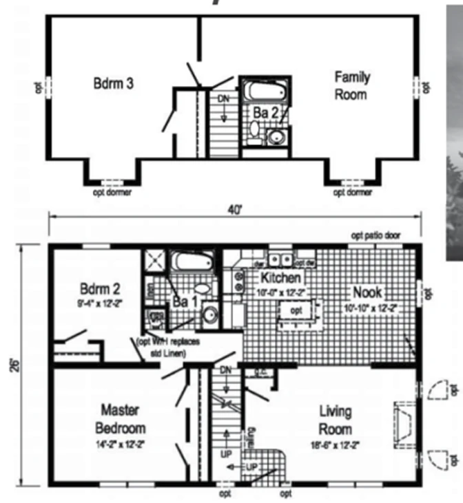 - Bedrooms & Baths: This plan includes a second 9'-4" x 12'-2" bedroom and a full bathroom on the first floor, with options for a third bedroom and second full bath on the upper level.