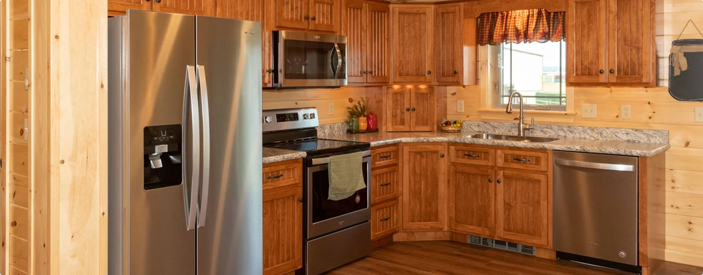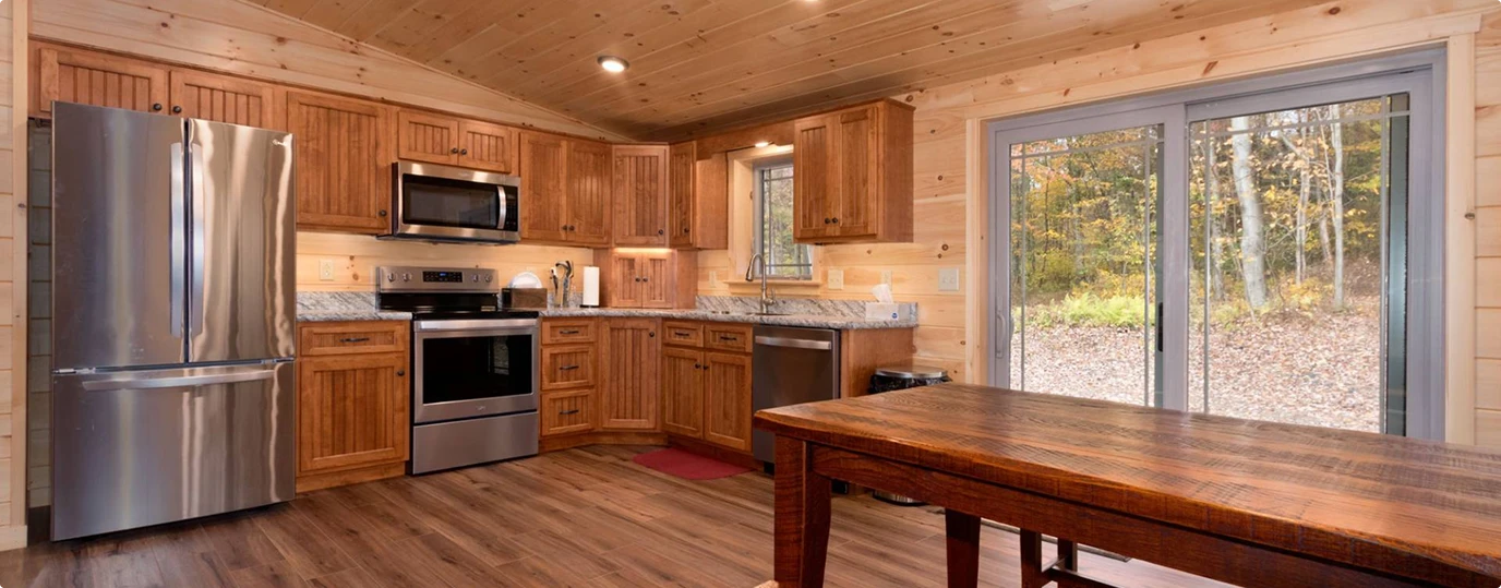 - Kitchens: Our knotty pine kitchens feature solid-wood, soft-close drawers, a double-bowl stainless steel sink with a Moen faucet, and laminate countertops.