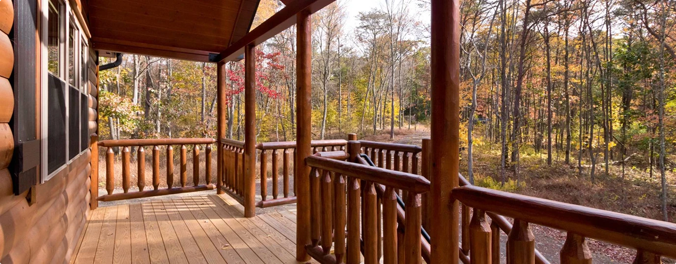 - Log Railings: The porch is finished with authentic round log railings, completing the classic cabin aesthetic.