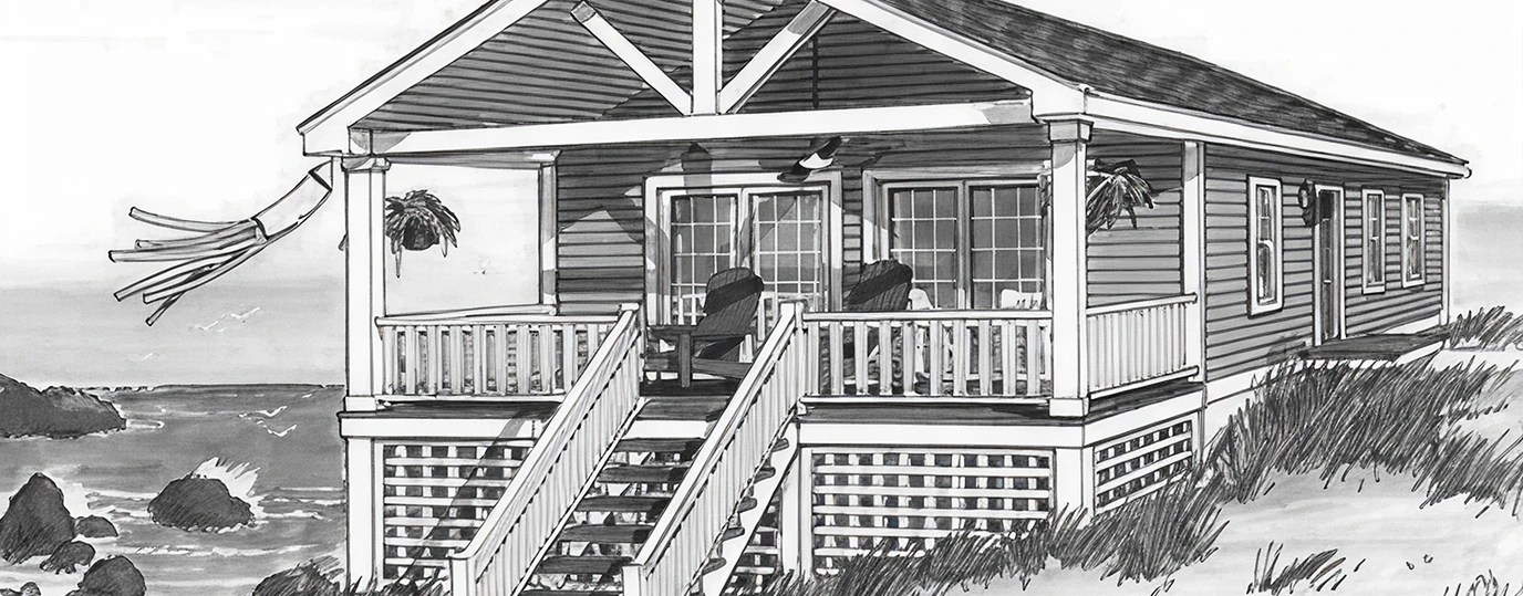 The Cedarview is a charming and efficient vacation cottage that packs plenty of living space into a compact footprint. This 988 sq. ft. floor plan is perfect for a weekend getaway or a simple full-time residence, featuring three bedrooms and two full bathrooms. The home is designed for relaxed living, with a large, open-concept living and dining room that flows into the kitchen. With its beautiful covered front porch, The Cedarview is the ideal home for enjoying a lake, beach, or mountain view.