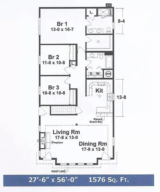 - Three-Bedroom Layout: This plan includes three comfortable bedrooms. The master bedroom (Br 1) measures 13'-0" x 16'-7", Bedroom 2 is 11'-0" x 10'-8", and Bedroom 3 is 10'-8" x 10'-8".
