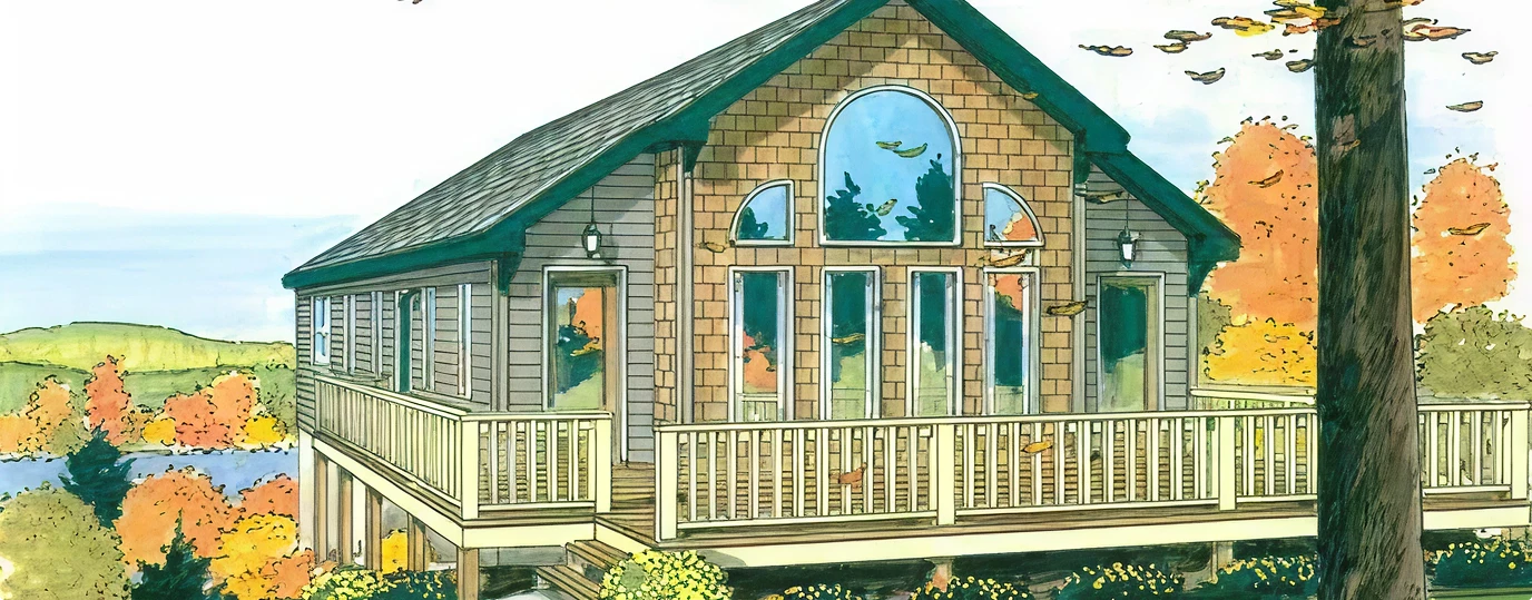 - Large Front Deck: The rendering showcases a large deck across the front of the home, perfect for outdoor dining and enjoying the surrounding landscape.