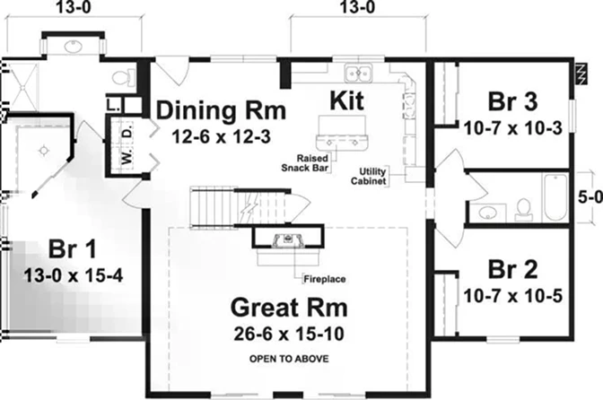 - Three-Bedroom Layout: This plan includes three comfortable bedrooms. The master bedroom (Br 1) measures 13'-0" x 15'-4", Bedroom 2 is 10'-7" x 10'-5", and Bedroom 3 is 10'-7" x 10'-3".