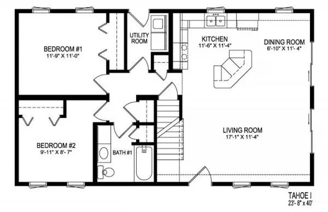 - Two-Bedroom Layout: This plan includes two comfortable bedrooms. Bedroom #1 measures 11'-9" x 11'-0", and Bedroom #2 is 9'-11" x 8'-7".