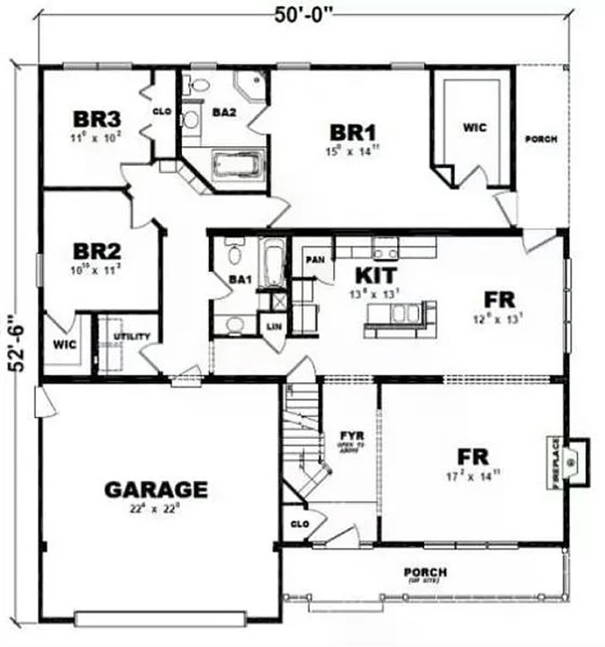 The plan includes 3 bedrooms and 2 full bathrooms. The home's total footprint measures 50'-0" wide by 52'-6" deep. A key feature of this design is the integrated 2-car garage, measuring 22' x 22', which offers protected parking and direct, easy access into the home. The plan is designed with a stairway to a lower level, making it perfectly suited for a full basement foundation.