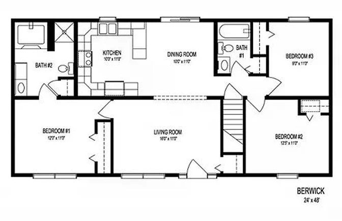 The Berwick is a classic ranch home that combines a timeless exterior with a highly functional, family-friendly layout. This 1,152 sq. ft. plan provides all the convenience of single-story living with three large bedrooms and two full bathrooms. The home features a spacious kitchen, defined living and dining areas, and a full-width covered front porch that creates wonderful curb appeal. For those seeking a traditional and practical home, The Berwick is an outstanding choice.