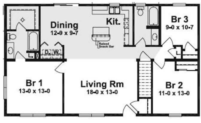 - Comfortable Bedrooms: This plan includes three bedrooms. Bedroom #1 measures 13'-0" x 13'-0", Bedroom #2 is 11'-0" x 13'-0", and Bedroom #3 is 9'-0" x 10'-7".