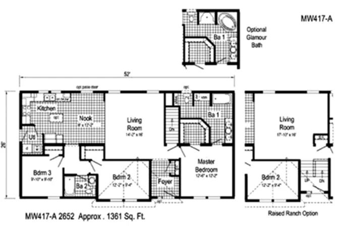 The Crestwood is a popular and versatile ranch home that features a smart, split-bedroom layout. This 1,361 sq. ft. plan offers the best of single-story living with three bedrooms and two full bathrooms. The home is designed around a spacious and open living room, kitchen, and nook area, creating a welcoming environment for family and friends. With several available options, including a "glamour bath" and a raised ranch configuration, The Crestwood can be perfectly tailored to your needs.
