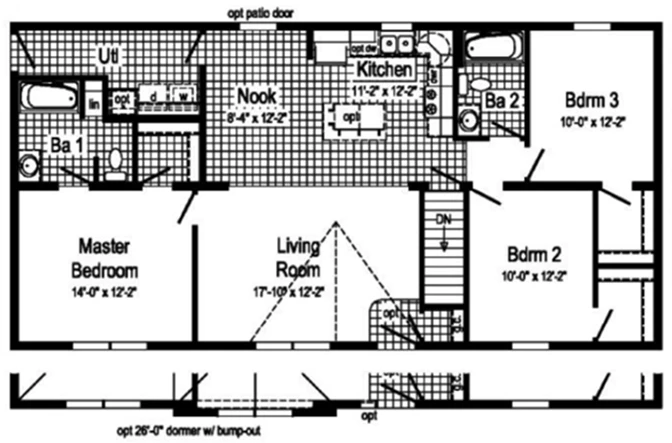 - Split-Bedroom Design: The private master bedroom (14'-0" x 12'-2") is located on one side of the home, while two additional bedrooms (both 10'-0" x 12'-2") are situated on the opposite side for privacy.