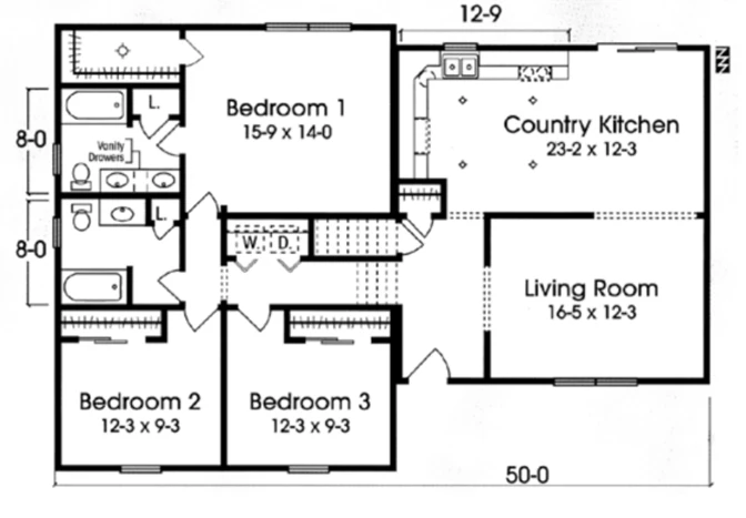 - Split-Bedroom Design: The private master bedroom is located on one side of the home, while two additional bedrooms (both 12'-3" x 9'-3") are situated on the opposite side for privacy.