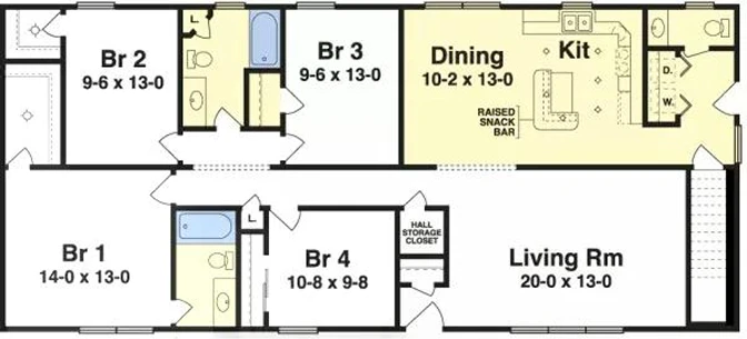 - Four-Bedroom Layout: This plan includes four comfortable bedrooms. Bedroom #1 measures 14'-0" x 13'-0", Bedrooms #2 and #3 are both 9'-6" x 13'-0", and Bedroom #4 is 10'-8" x 9'-8".