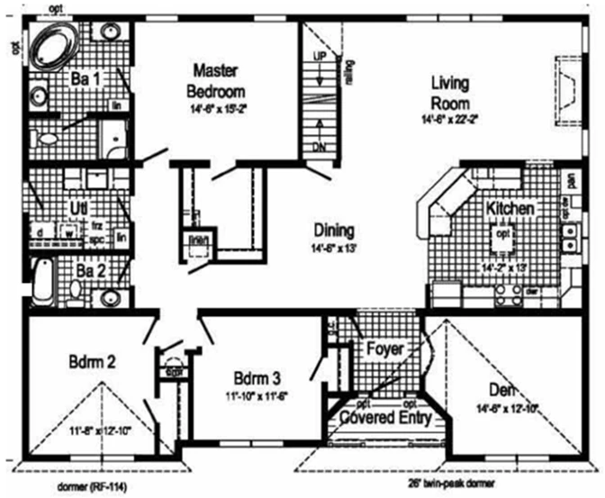 - Multiple Living Spaces: This home features a large living room (14'-8" x 22'-2"), a formal dining room (14'-6" x 13'), and a private den (14'-8" x 12'-10"), providing an abundance of flexible space.