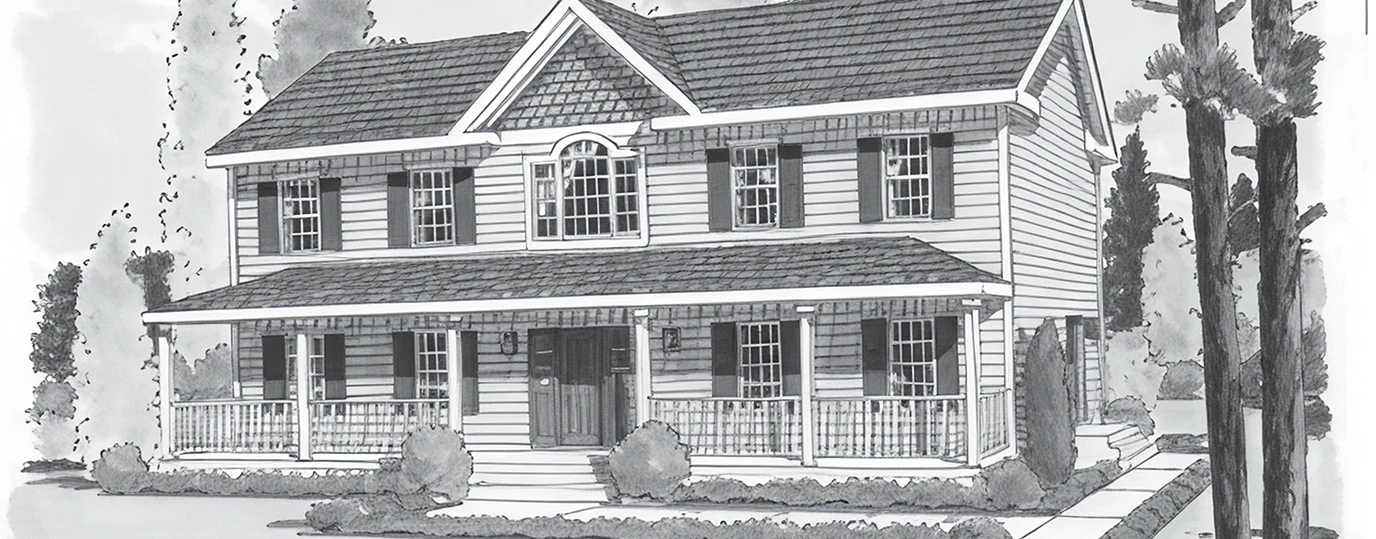 The Fitchburg features a classic two-story colonial exterior with a full front porch that creates a timeless and welcoming curb appeal.