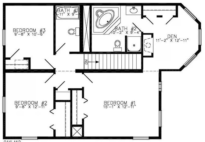 The Oakland features a distinctive exterior with a unique turret-style front and multiple gables that create an elegant and memorable curb appeal.