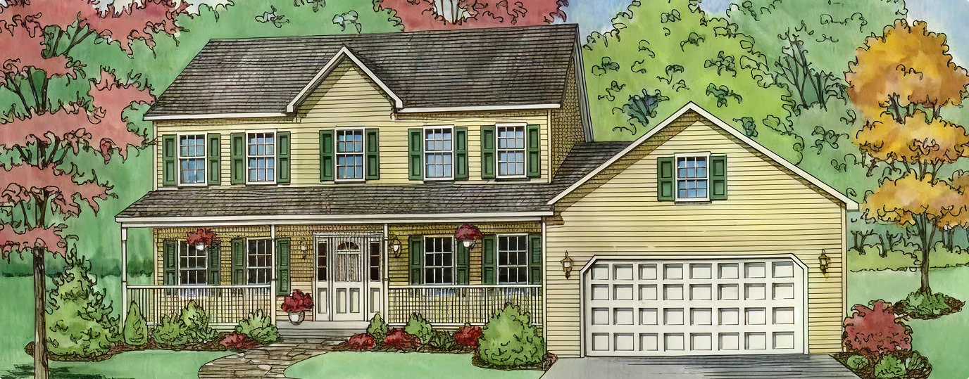 The West Point features a stately and traditional two-story exterior with a charming front porch that creates a classic, welcoming curb appeal.